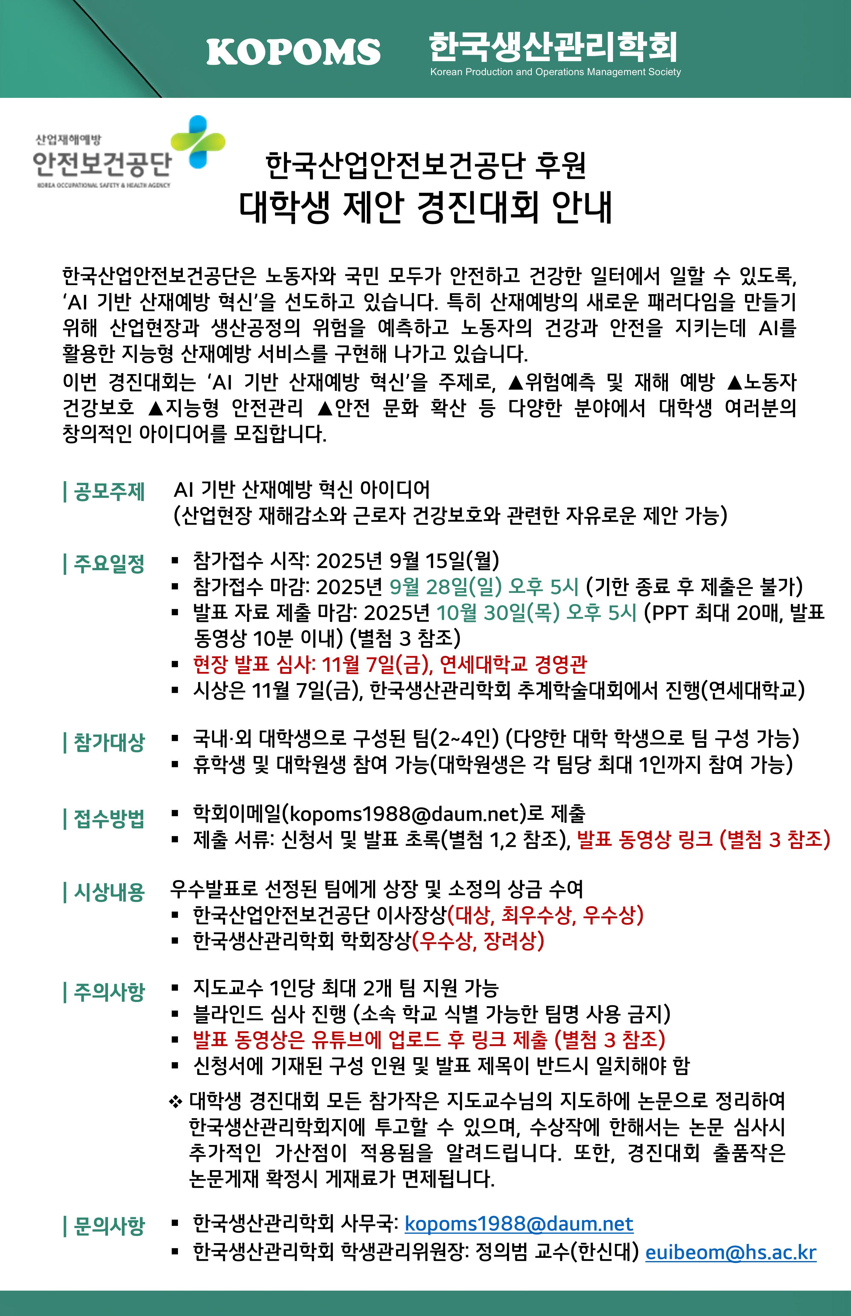 [한국생산관리학회] 2025년 한국생산관리학회 추계학술대회 한국산업안전보건공단 대학생 제안 경진대회 접수 ...