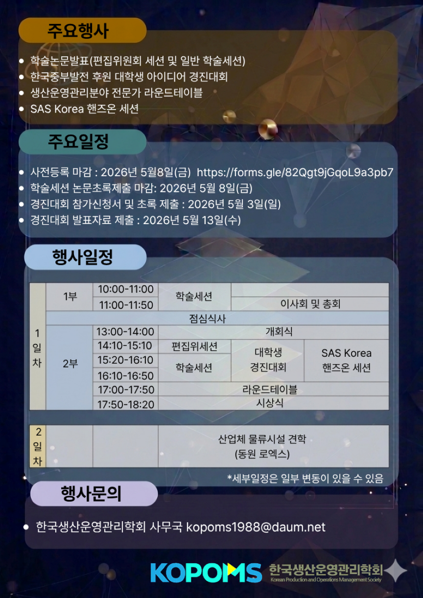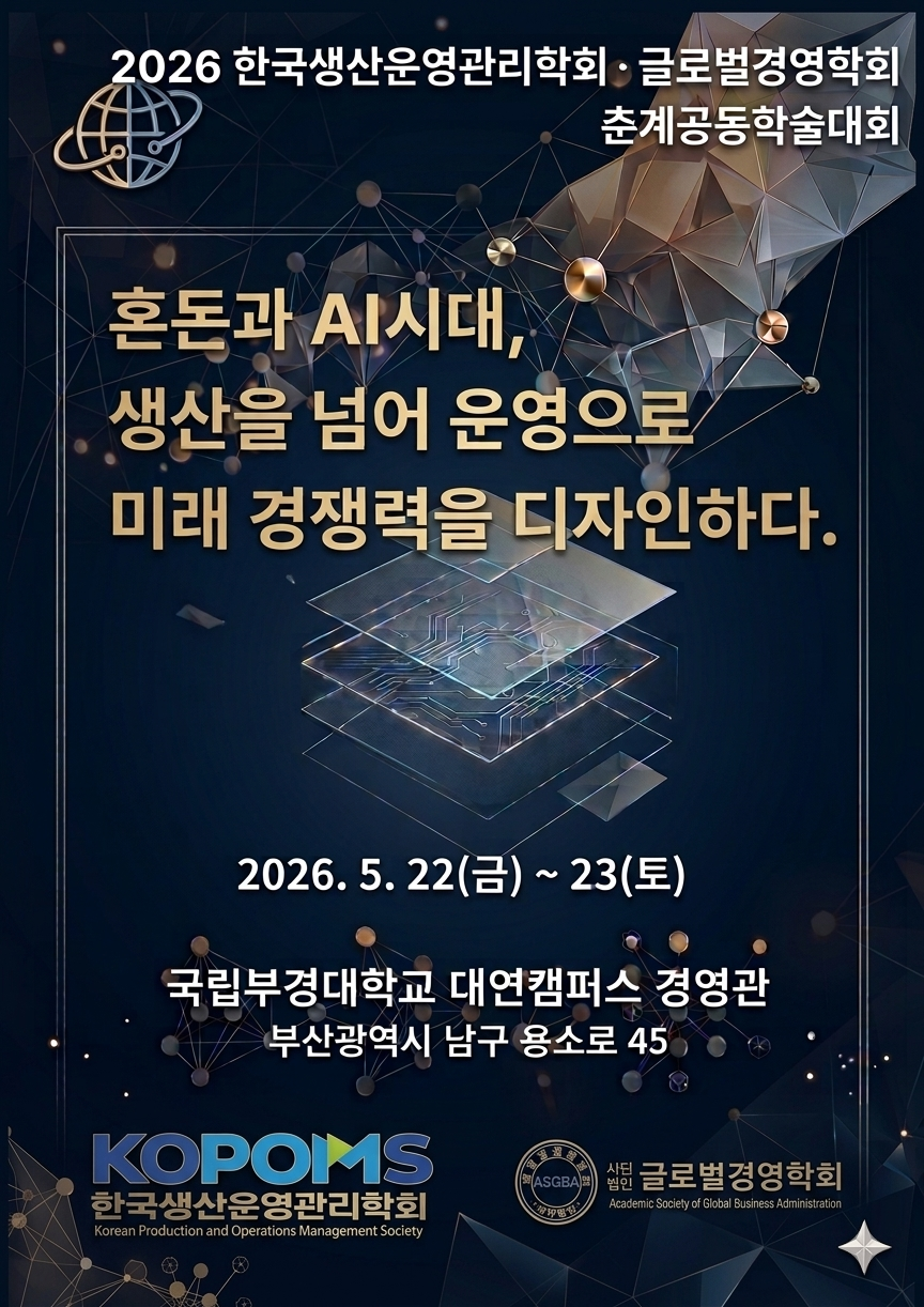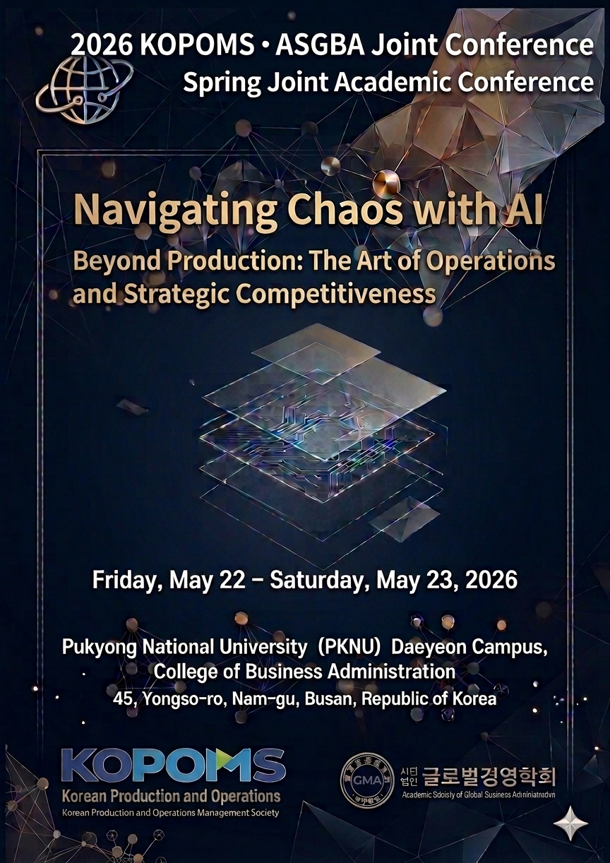 2026 한국생산운영관리학회 춘계학술대회는 “혼돈과 AI시대, 생산을 넘어 운영으로 미래 경쟁력을 디자인하다.”를 주제로 개최됩니다. 여러분의 많은 참여와 관심 부탁드립니다.