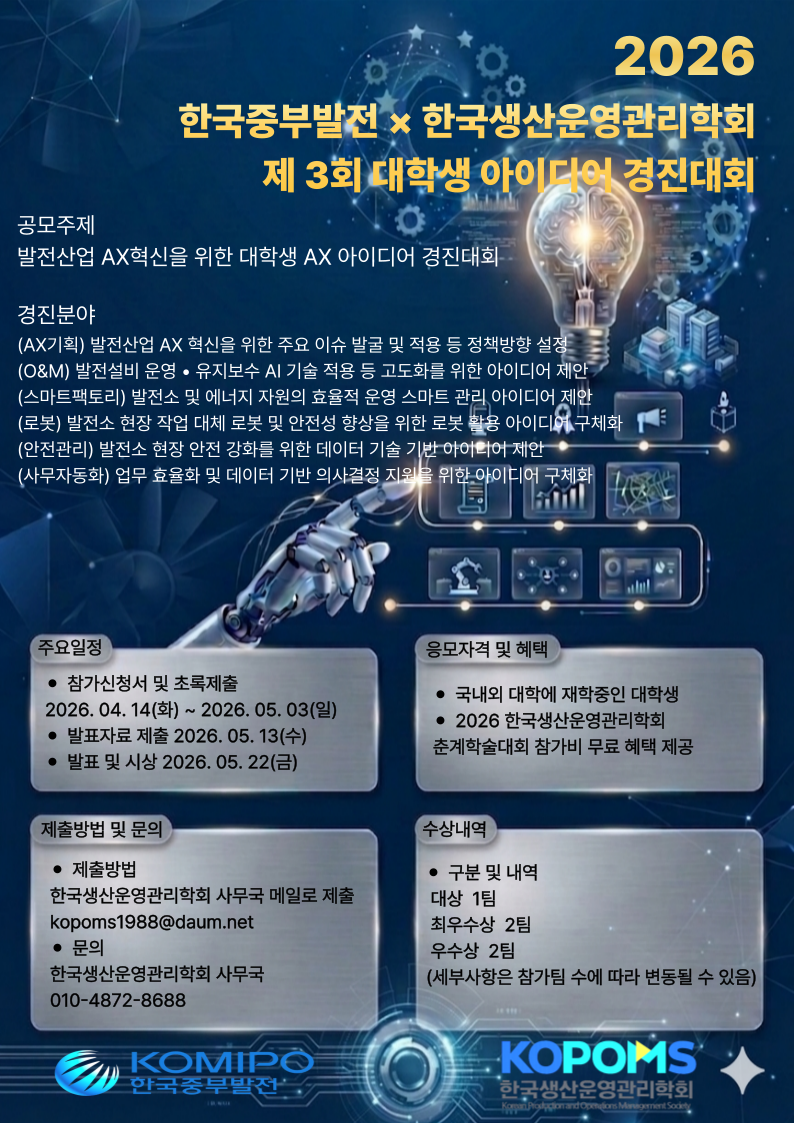 금번 부산 국립부경대학교에서 개최되는 2026년 한국생산운영관리학회 춘계학술대회에서 한국중부발전의 후원으로 다음과 같이 대학생 아이디어 경진대회가 개최됩니다.