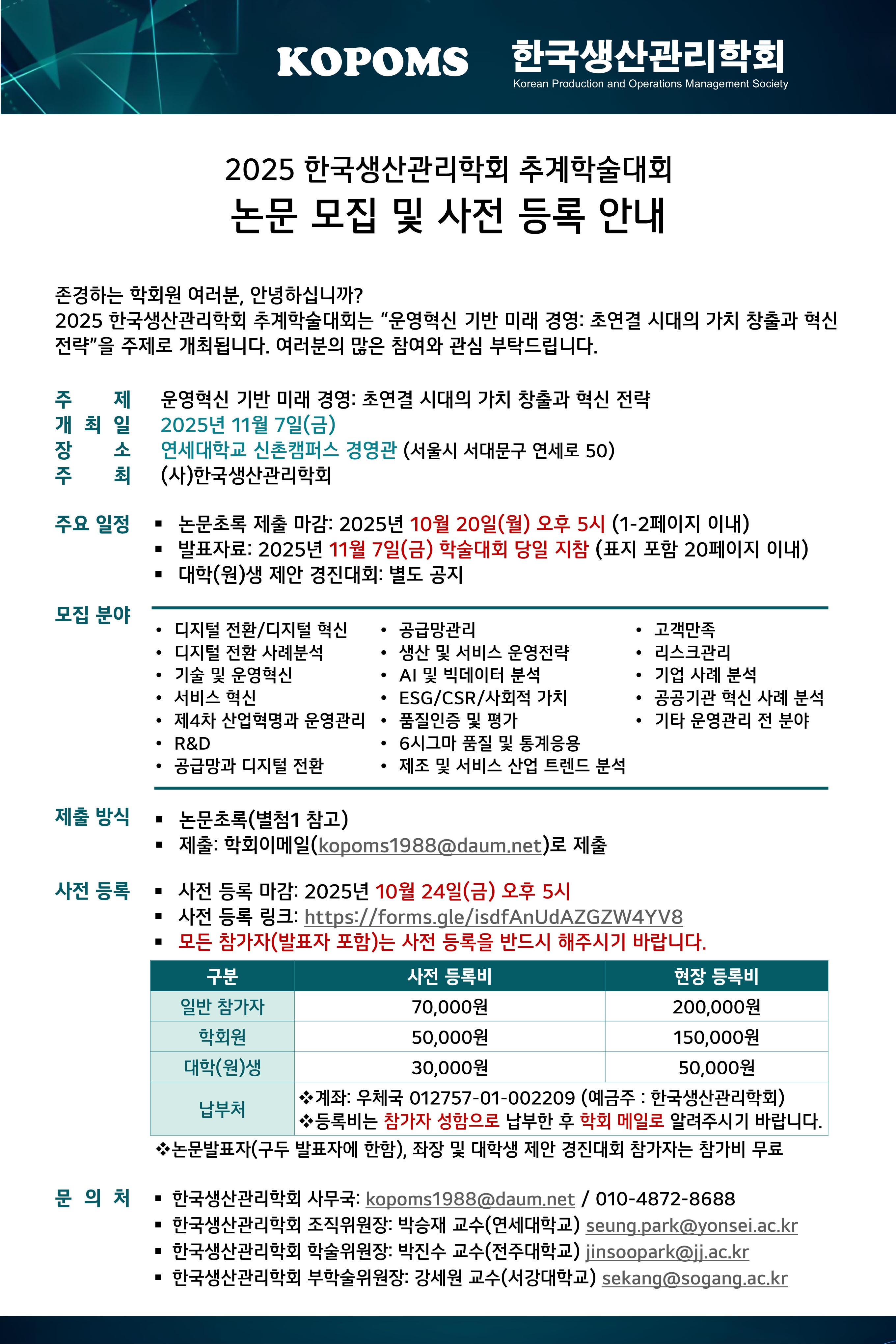 2025 한국생산관리학회 추계학술대회는 “운영혁신 기반 미래 경영: 초연결 시대의 가치 창출과 혁신 전략”을 주제로 개최됩니다.
