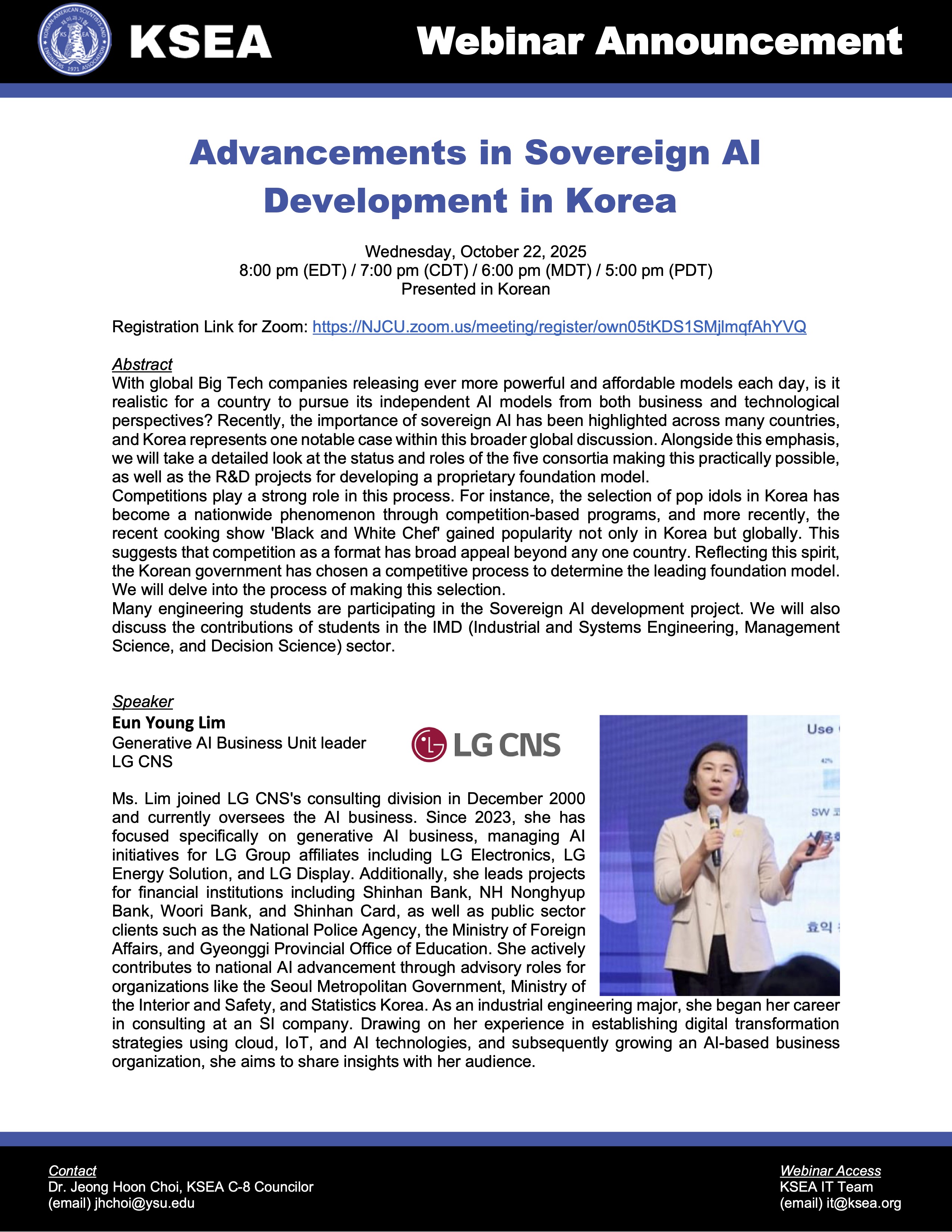Youngstown State University의 최정훈 교수님께서 미국내 재미한인과학기술자협회 (Korean-Americal Scientists and Engineers Association: KSEA) Technical Group C-8 IMD (Industrial and Systems Engineering, Management Science, and Decision Sciences)에서 개최하는 Webinar에 관한 소개 말씀을 다음과 같이 전달주셨습니다.